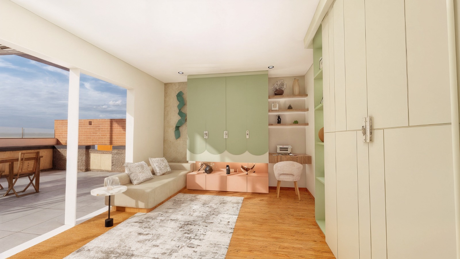 Diseño de la zona social, el área de trabajo y la sala de TV, que se integran en un ambiente dinámico, definido por una paleta de colores juveniles y vibrantes que aportan identidad al espacio. El contraste entre tonos, materiales y el uso de la luz genera un ambiente que equilibra creatividad, productividad y momentos de descanso.