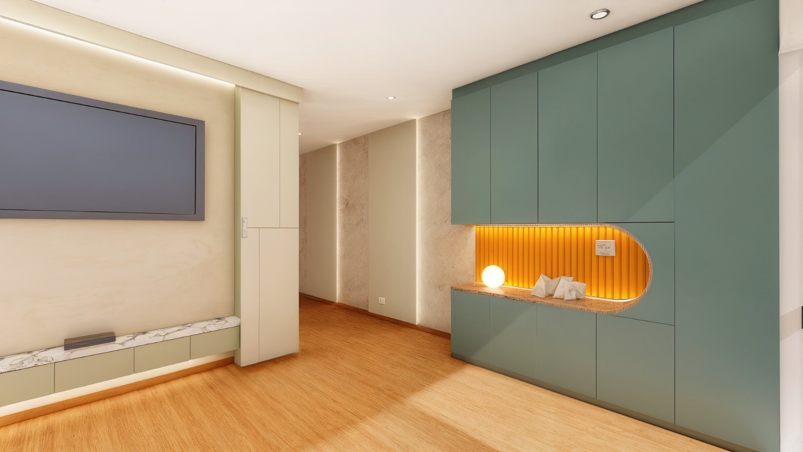 Diseño de la zona social, el área de trabajo y la sala de TV, que se integran en un ambiente dinámico, definido por una paleta de colores juveniles y vibrantes que aportan identidad al espacio. El contraste entre tonos, materiales y el uso de la luz genera un ambiente que equilibra creatividad, productividad y momentos de descanso.